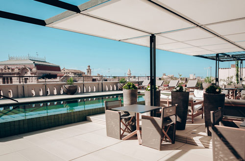 A panoramic 200 m2 terrace with spectacular views of the Church of Sant Francesc, a 30 m2 pool, a sun deck and a snack bar to enjoy light bites during daytime. During the summer months, as light goes down, a day to evening transformation takes place – converting the rooftop terrace into the perfect place for a cocktail or chilled glass of champagne, whilst listening to soulful beats and watching the sun set over Palma’s historic old town.